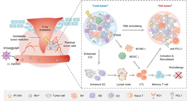 2022年5月20日,同濟(jì)大學(xué)醫(yī)學(xué)院岳雯雯研究員、復(fù)旦大學(xué)附屬中山醫(yī)院徐輝雄教授和上海大學(xué)陳雨教授聯(lián)合帶領(lǐng)團(tuán)隊(duì)在Nature Communications雜志上發(fā)表題為Nanoparticle-enhanced radiotherapy synergizes with PD-L1 blockade to limit post-surgical cancer recurrence and metastasis的文章,該研究通過構(gòu)建術(shù)后CT26小鼠結(jié)腸模型,證明了手術(shù)切除創(chuàng)造了一個以低氧和髓系細(xì)胞大量涌入為特征的免疫抑制環(huán)境,促進(jìn)了癌癥的發(fā)展,并阻礙了PD-L1阻斷治療。為了解決這一問題,團(tuán)隊(duì)設(shè)計(jì)開發(fā)了一種納米藥物IPI549@HMP,它能夠靶向髓系細(xì)胞,并催化內(nèi)源性過氧化氫生成O2,增強(qiáng)放射治療效果以及PD-L1治療的敏感性,從而抑制或消除殘留的部分癌細(xì)胞,并喚醒患者自身免疫力抵抗腫瘤復(fù)發(fā)。