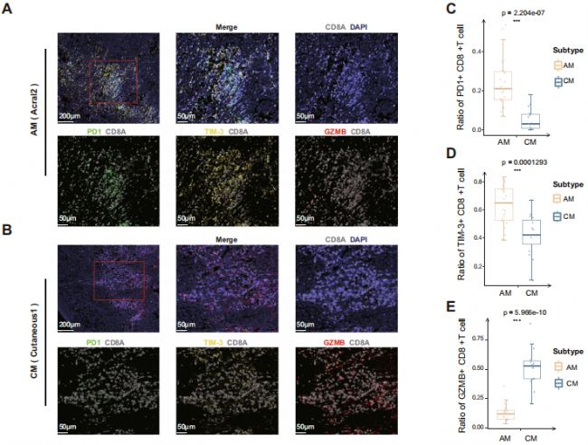 為了更好地理解肢端黑色素瘤,2022年11月25日,天津醫(yī)科大學(xué)楊吉龍、李祥春及陳可欣共同通訊在Nature Communications 發(fā)表題為“A single-cell analysis reveals tumor heterogeneity and immune environment of acral melanoma”的研究論文,對來自5個AM和3個CM樣本的63,394個細(xì)胞進(jìn)行了單細(xì)胞RNA測序,以研究腫瘤的異質(zhì)性和免疫環(huán)境。研究發(fā)現(xiàn)與CM相比,AM具有明顯的免疫抑制狀態(tài),PD-1和TIM-3在AM的耗竭CD8+T細(xì)胞中高表達(dá)。