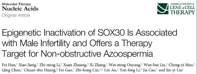 Han F, Jiang X, Li ZM, Zhuang X, Zhang X, Ouyang WM, Liu WB, Mao CY, Chen Q, Huang CS, Gao F, Cui ZH, Ao L, Li YF, Cao J, Liu JY. Epigenetic Inactivation of SOX30 Is Associated with Male Infertility and Offers a Therapy Target for Non-obstructive Azoospermia. Mol Ther Nucleic Acids. 2020 Mar 6;19:72-83.