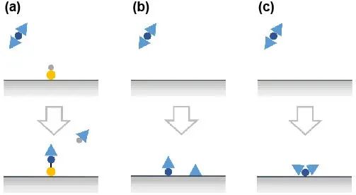 圖2 化學(xué)吸附機(jī)制示意圖。(a)配體交換;(b)解離吸附;(c)非解離吸附。