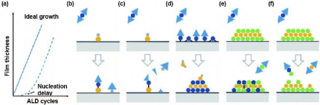 圖3 ALD非理想因素。(a)成核延遲;(b)副產(chǎn)物吸附;(c)配體分解;(d)團(tuán)聚;(e)離子擴(kuò)散;(f)刻蝕效應(yīng)。