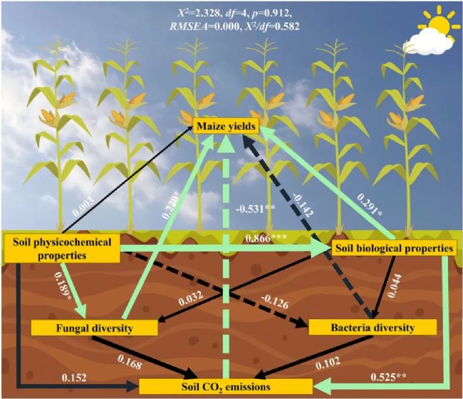 基于結構方程模型的土壤理化、生物學特性和真菌、細菌多樣性對土壤CO2排放和玉米產(chǎn)量的影響