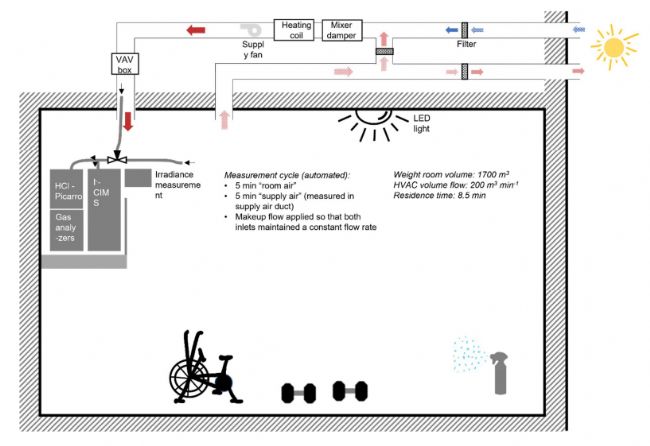 基于此,研究人員于2018年11月1-20日在美國科羅拉多大學博爾德校區(qū)運動中心的舉重室(無窗、使用發(fā)光二極管 (LED) 照明)對幾種潛在的自由基源進行了為期兩周的測量。通過供暖、通風和空調系統(tǒng)調節(jié)室內空氣交換。旨在(1)確定運動設施中Cl*和N2O5的水平和時間變化;(2)評估清潔事件對Cl*的影響;(3)確定設施中形成NO3、N2O5和ClNO2的可能性。