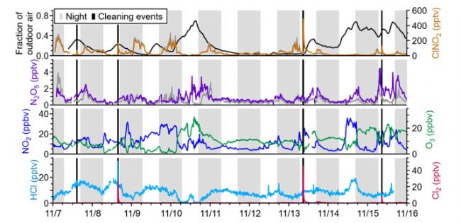 整個試驗期對實驗器材進行了6次消毒,其中11月7-16日(本研究所使用的數據)使用二氯清潔溶液(一旦溶解在水中就會形成HOCl)消毒了四次。測量了Cl2、HOCl、ClNO2、氯胺(NCl3,NHCl2, NH2Cl)、N2O5、NO3-、HCl(Picarro SI2108氣體濃度分析儀)、NO、NO2、O3濃度,350-750 nm的光譜輻照度,以及單萜類物質,并計算了Cl*光解產生Cl的速率、NO3和N2O5的形成和損失。