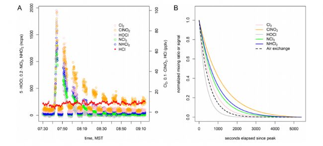 以及計算出的送風系統(tǒng)中室外空氣的比例(黑色跡線)。(A) 11月13日清潔事件中觀察到的某些Cl*物種含量的變化。(B)比較物種之間的衰減率。