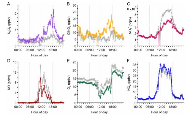 11月14日室內空氣(彩色跡線)和送風系統(tǒng)(灰色跡線)中(A)N2O5、(B)ClNO2、(C) NO3−、(D)NO、(E)O3和(F)NO2 5分鐘平均測量值的日變化。