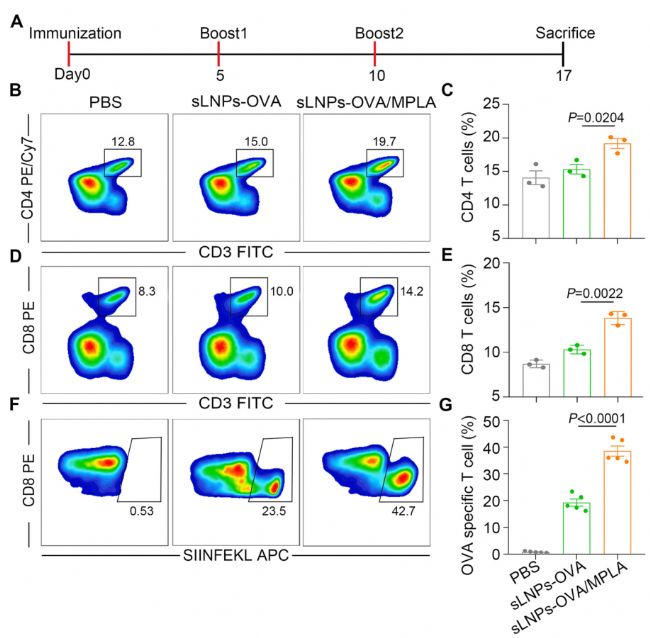 在預(yù)防性小鼠模型中,sLNPs-OVA/MPLA誘導(dǎo)了一種有效的抗原特異性細(xì)胞毒性T細(xì)胞免疫反應(yīng),并最終通過持久的免疫記憶保護(hù)阻止了EG.7-OVA腫瘤的生長(zhǎng)。