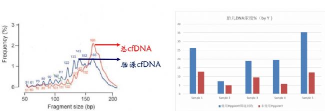2010年,來自“NIPT之父”,香港中文大學盧煜明教授研究團隊發(fā)表在Science轉(zhuǎn)化醫(yī)學子刊的一篇文獻中指出:胎兒cfDNA與母體cfDNA在片段大小分布上最顯著的區(qū)別是胎兒cfDNA在166bp峰值處的含量較低,但在143bp處存在一個突出的峰,提示胎兒cfDNA含有更多比母體DNA小約20bp的DNA分子(見圖2左)。因此,研究人員就可以利用Pippin系列產(chǎn)品定向收集長度為143bp的片段,實現(xiàn)胎兒cfDNA的富集,提高檢測準確率(圖2右)。