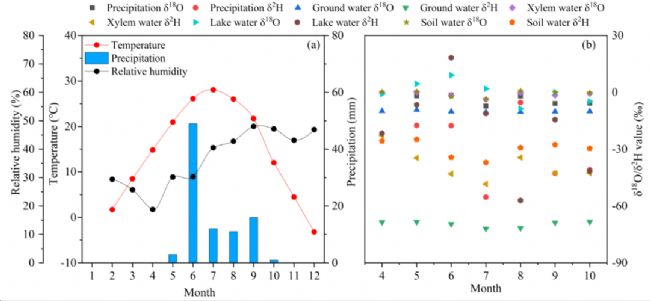 基于此,在本研究中,來(lái)自西北師范大學(xué)的研究團(tuán)隊(duì)于2019年植物生長(zhǎng)季在中國(guó)西北石羊河流域尾閭湖青土湖區(qū)收集了0–10,10–20,20–30,30–40,40–50和50–60 cm層的土壤、植物莖部、降水、地下水和湖水。利用LI-2100全自動(dòng)真空冷凝抽提系統(tǒng)(北京理加聯(lián)合科技有限公司)提取土壤和植物莖中的水分。并測(cè)定了不同水體同位素?cái)?shù)據(jù)(δ2H和δ18O)和相關(guān)水文氣象數(shù)據(jù),以揭示尾閭湖區(qū)典型植被對(duì)生態(tài)輸水的響應(yīng)機(jī)制。研究結(jié)果有助于我們了解干旱內(nèi)陸河流域下游人工輸水背景下植物的適應(yīng)機(jī)制,為水資源的合理利用和生態(tài)建設(shè)提供參考。