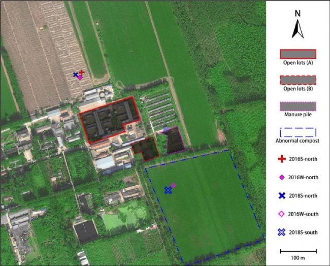 北京大學(xué)環(huán)境科學(xué)與工程學(xué)院蔡旭暉研究團(tuán)隊(duì)于2016.6.29-7.18(2016S,探索階段)、2016.12.16-2017.1.10(2016W)、2018.6.1-7.2(2018S)三個(gè)試驗(yàn)階段在北京西北郊區(qū)的一個(gè)開放式奶牛場(chǎng)(403±5頭荷斯坦奶牛,自由走動(dòng),具有“華北平原農(nóng)場(chǎng)規(guī)模和奶牛類型”的代表性)利用微氣象方法估算了華北平原典型奶牛場(chǎng)的氨排放量。使用定制的9 m可伸縮塔作為每個(gè)觀測(cè)點(diǎn)的觀測(cè)平臺(tái),所有儀器均安裝在塔上,距地面高度大致相同(8 m)。測(cè)量了NH3濃度、氣象參數(shù)(風(fēng)速和風(fēng)向、氣溫、濕度)、湍流變量,經(jīng)過(guò)嚴(yán)格的質(zhì)量控制和篩選后,利用Inverse dispersion method(IDM)和分析足跡模型確定氨排放率,并確定奶牛場(chǎng)的排放因子。