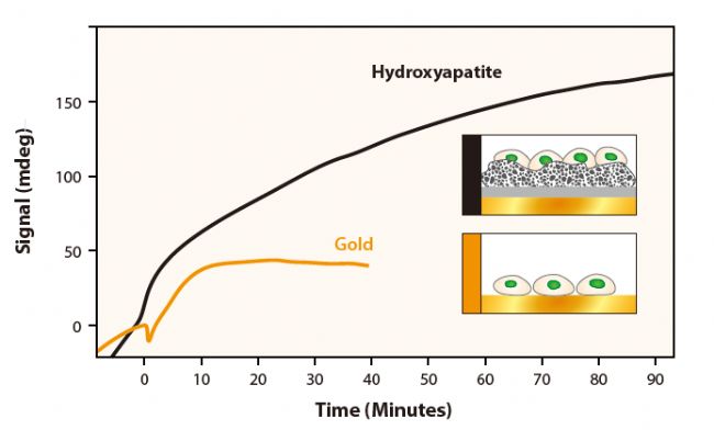 采用多參數(shù)表面等離子體共振(MP-SPR)技術(shù)測定了人間充質(zhì)干細胞(ADMSC)和溶菌酶蛋白在幾十微米厚的羥基磷灰石(HA)表面上的附著。羥基磷灰石是存在于牙齒和骨骼中的一種成分,其合成形式被廣泛用于骨科假體中,以增強種植體的骨整合。MP-SPR測量結(jié)果表明,細胞傾向于與HA涂層結(jié)合,而不是金涂層。