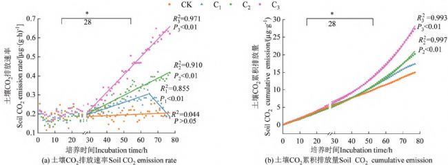 注:*表示培養(yǎng)28h前后的土壤CO2排放速率、土壤CO2累積排放量差異顯著(P<0.05)