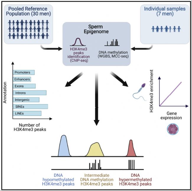2021年7月20日,加拿大麥吉爾大學(xué)Vanessa Dumeaux和Sarah Kimmins團(tuán)隊(duì)在《Cell Reports》雜志發(fā)表題為“Whole-genome sequencing of H3K4me3 and DNA methylation in human sperm reveals regions of overlap linked to fertility and development”的研究論文,該研究以男性精子樣本為對(duì)象,通過ChIP-seq和WGBS等技術(shù)研究了 H3K4me3 在精子中的位點(diǎn)及其與相同樣本中精子 DNA 甲基化譜的關(guān)系。