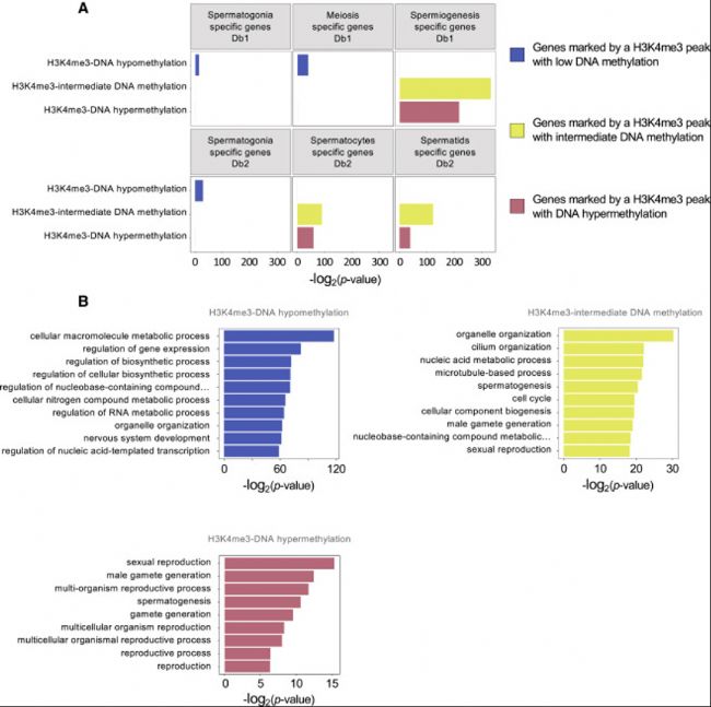- H3K4me3過表達(dá)在精子發(fā)生相關(guān)基因啟動(dòng)子區(qū)域具有低、中、高平均DNA甲基化peaks值。與早期精子發(fā)生、減數(shù)分裂和精子發(fā)生相關(guān)的基因選自兩個(gè)數(shù)據(jù)庫:Db1(Jan et al.,2017)和Db2(Wang et al.,2018)。給出了Benjamini-Hochberg校正的超幾何最小似然p值。