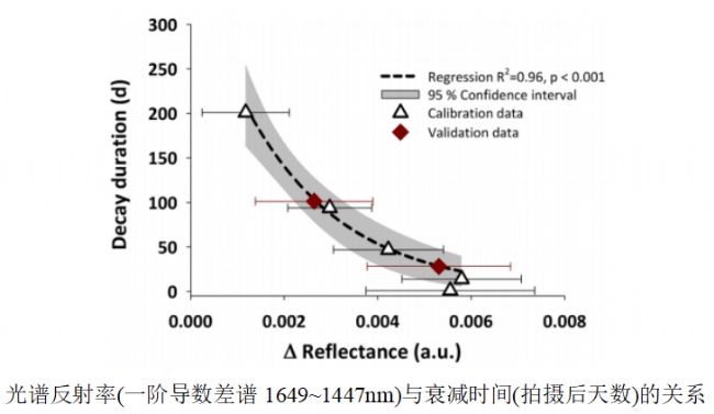Gernot et.al基于根箱培養(yǎng)技術(shù)對(duì)小麥進(jìn)行培養(yǎng),并對(duì)植株進(jìn)行扦插處理,基于根系高光譜成像技術(shù),在扦插后第14、28、47、94、101和201天分別對(duì)根箱的上三分之一進(jìn)行高光譜成像(900-1700nm);谝浑A導(dǎo)數(shù)差分光譜(1649-1447nm)構(gòu)建根系腐爛時(shí)間指數(shù)模型,使用修剪后28天和101天的光譜數(shù)據(jù)作為驗(yàn)證集,其R