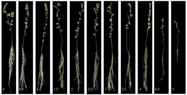 Afef et.al以不同基因型扁豆為實(shí)驗(yàn)對(duì)象,設(shè)置對(duì)照組和實(shí)驗(yàn)組,培養(yǎng)14日后實(shí)驗(yàn)組接種黃芽孢桿菌,對(duì)照組施以清水。接種14日后使用0-5疾病評(píng)分量表對(duì)根系進(jìn)行評(píng)分,作為地面參考數(shù)據(jù)