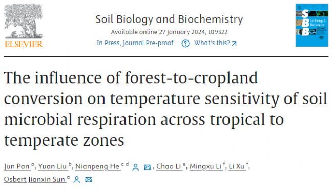 Pan J, He NP, Li C, Li MX, Xu L, Osbert Sun JX. 2024. The influence of forest-to-cropland conversion on temperature sensitivity of soil microbial respiration across tropical to temperate zones. Soil Biology and Biochemistry, doi:10.1016/j. soilbio.2024.109322.