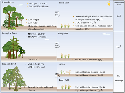 土地利用變化是當(dāng)前生物圈碳循環(huán)的主要人為驅(qū)動(dòng)因素之一(也是全球變化的重要組成要素),土地利用變化將促進(jìn)/抑制土壤碳釋放到大氣中,被認(rèn)為是僅次于化石燃燒的第二大人為碳源,累計(jì)約占人為二氧化碳排放量的12.5%。由于人口的增長和對(duì)農(nóng)產(chǎn)品需求的增加,全球范圍內(nèi)大量森林生態(tài)系統(tǒng)已被轉(zhuǎn)化為農(nóng)業(yè)生態(tài)系統(tǒng)。這些與農(nóng)業(yè)相關(guān)的森林砍伐,不僅會(huì)導(dǎo)致生物多樣性喪失,改變土壤碳循環(huán)過程,還可能削弱生態(tài)系統(tǒng)應(yīng)對(duì)氣候變化的能力。由于土壤微生物呼吸對(duì)溫度變化的響應(yīng)異常敏感,土壤Q10對(duì)土地利用變化的潛在響應(yīng)(提升或壓制),可能會(huì)對(duì)未來氣候產(chǎn)生重大影響。因此,為了提高人們關(guān)于土地利用變化對(duì)土壤碳循環(huán)的影響及其對(duì)氣候變化反饋的認(rèn)識(shí),確定Q10對(duì)土地利用變化響應(yīng)的生物地理格局及其調(diào)控因素至關(guān)重要(圖1)。