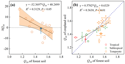 總的來說,相關(guān)研究結(jié)果凸顯了與長期土地利用變化相關(guān)的生物地理變化對(duì)土壤微生物呼吸溫度響應(yīng)的潛在影響,并強(qiáng)調(diào)了將長期土地利用對(duì)土壤溫度敏感性的影響納入陸地碳循環(huán)模型以改進(jìn)未來碳-氣候反饋預(yù)測(cè)的重要性。