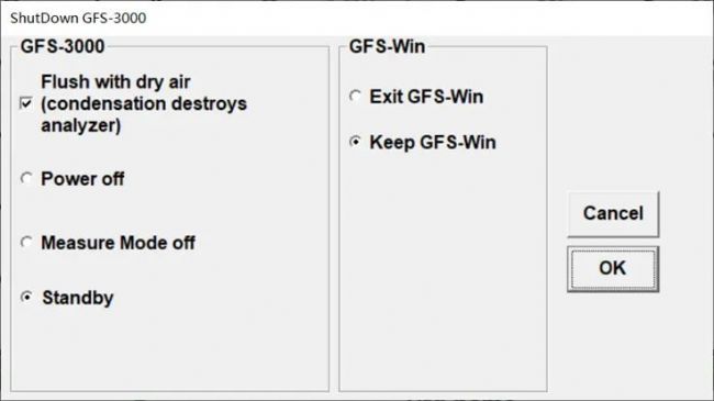 如果只是短暫的休息,可將GFS-3000置于Standby,系統(tǒng)會在干燥氣體沖刷分析器后關(guān)閉顯示器,進(jìn)入待機(jī)模式。休息結(jié)束后,只需再次點(diǎn)擊屏幕即可將GFS-3000從待機(jī)模式喚醒,然后點(diǎn)擊菜單欄的On/Off,選擇Measure Mode On快速進(jìn)入測量模式,無需預(yù)熱,但是建議再次調(diào)零后開始測量。