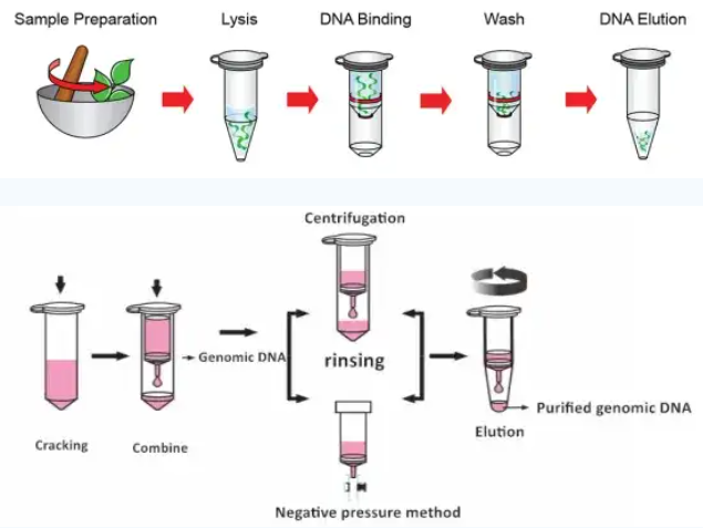 通過特殊硅基質(zhì)吸附材料,能夠特定吸附DNA,而RNA和蛋白質(zhì)順利通過,然后利用高鹽低PH結(jié)合核酸,低鹽高PH值洗脫,來分離純化核酸。離心柱純化也是試劑盒提取中廣泛的使用方法。