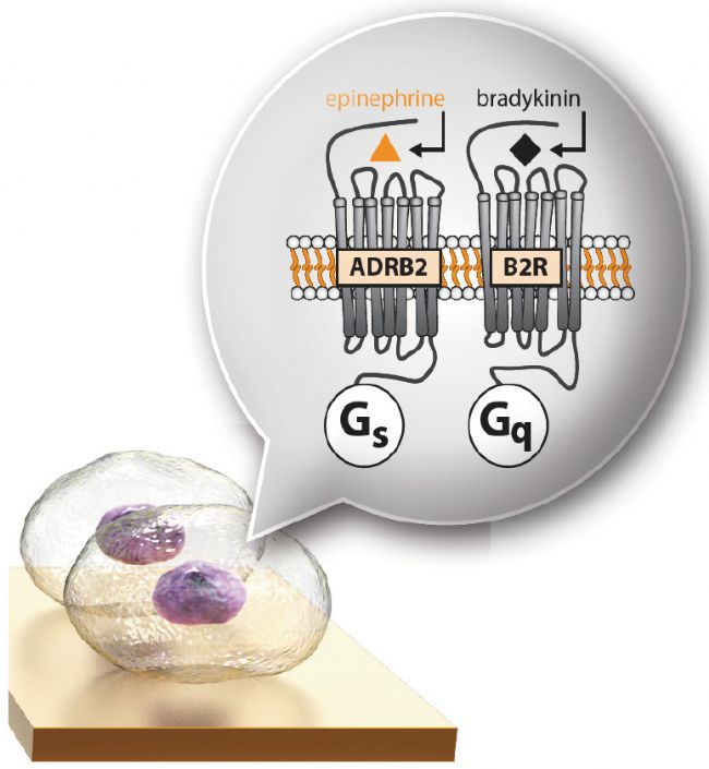 圖2:腎上腺素刺激β2-腎上腺素受體激活Gs通路,緩激素B2受體激活Gq通路。