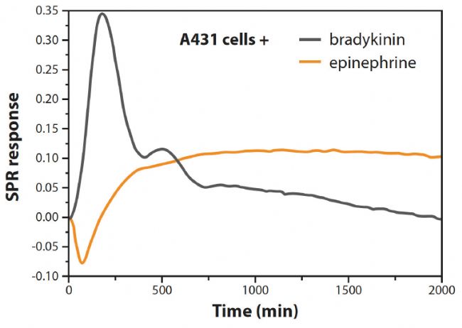 A431細(xì)胞受到緩激肽和腎上腺素的刺激。緩激素與緩激素B2受體結(jié)合,激活Gq通路,而腎上腺素與β2腎上腺素受體結(jié)合,激活Gs通路(圖2)。不同濃度的腎上腺素和緩激素刺激A431細(xì)胞導(dǎo)致獨特的時間依賴性PAP譜(圖3)。組胺結(jié)合組胺H1和H3受體,分別激活Gq和Gi通路。這導(dǎo)致了同樣獨特的PAP譜(數(shù)據(jù)未顯示)。