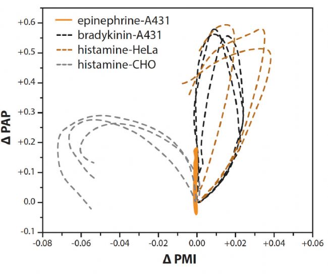 圖4:雙參數(shù)PMI-PAP反應(yīng)譜,PAP(峰值角位置)反應(yīng)與PMI(峰值最小強(qiáng)度)反應(yīng)對應(yīng),不同激動劑和細(xì)胞系的明確可區(qū)分模式。