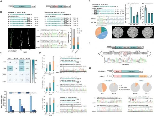 為了評估FrCas9系統(tǒng)編輯TA豐富序列時的潛力以及在水稻中的編輯表現(xiàn),作者在水稻PDS基因位點(diǎn)上設(shè)計(jì)了16個包含所有可能的5'-NNTA-3' PAM的sgRNA,通過對穩(wěn)定轉(zhuǎn)化水稻愈傷組織的高通量測序表明,F(xiàn)rCas9系統(tǒng)編輯效率范圍從1.1%到35.3%,表明FrCas9的高PAM兼容性。FrCas9系統(tǒng)在TGTA、TATA和AGTA PAM位點(diǎn)編輯效率較高,分別達(dá)到35.3%、33.8%和32.1%,這與NNTA PAM的第二個核苷酸偏好為R(A/G)的假設(shè)一致。