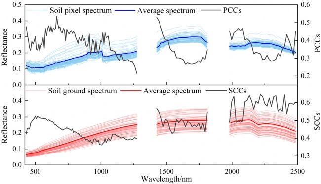 為了驗(yàn)證ZY1-02D高光譜圖像的可靠性,將土壤像素光譜與土壤地面光譜進(jìn)行了比較(圖4)。盡管土壤像素光譜的形狀與土壤地面光譜相似,但在可見(jiàn)光-近紅外(VNIR)波段范圍內(nèi)存在一些噪聲和平滑度較低的情況。此外,土壤像素的光譜反射率略低于實(shí)驗(yàn)室測(cè)量的反射率。計(jì)算了像素反射率與地面反射率之間的斯皮爾曼相關(guān)系數(shù)(SCCs)和皮爾遜相關(guān)系數(shù)(PCCs)。結(jié)果表明,大多數(shù)波長(zhǎng)范圍內(nèi)的PCCs低于0.5,而在480至680nm和2000至2500nm波長(zhǎng)范圍內(nèi)的SCCs基本大于0.5,表明可能存在非線性關(guān)系。為了揭示影響像素光譜的因素,比較了不同物理屬性梯度下土壤反射率的差異。隨著SM的增加,土壤光譜反射率顯著下降,尤其是在500至1300nm和1450至1700nm波長(zhǎng)范圍內(nèi)(圖5)。隨著SBW的增加,土壤光譜反射率的下降幅度相對(duì)較小。RMSH對(duì)土壤光譜的影響最為顯著,反射率隨著RMSH的增加顯著下降。綜上所述,SM、SBW和RMSH對(duì)光譜的耦合效應(yīng)是導(dǎo)致兩組光譜數(shù)據(jù)偏差的重要原因,嚴(yán)重限制了成像光譜儀對(duì)土壤“純光譜”的獲取。因此,有必要在像素光譜數(shù)據(jù)中分離土壤的物理和化學(xué)信息,以提高高光譜遙感對(duì)土壤有機(jī)質(zhì)(SOM)預(yù)測(cè)的準(zhǔn)確性。
