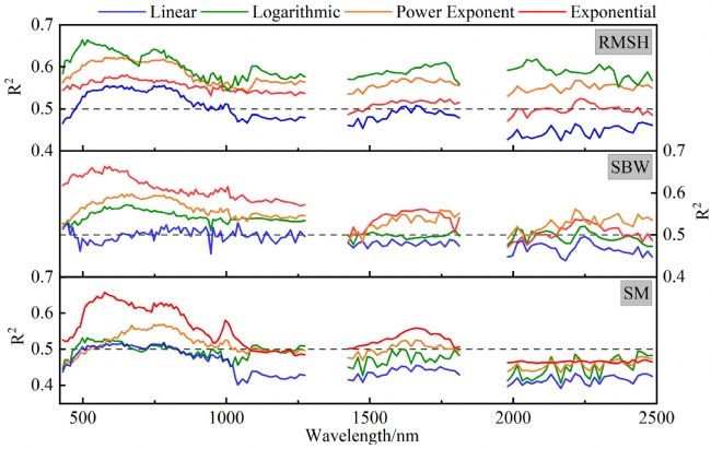 土壤像素光譜反射率與土壤地面光譜反射率呈非線性關(guān)系。表面物理性質(zhì)的差異是導(dǎo)致這兩種光譜數(shù)據(jù)類(lèi)型偏差的主要因素。RMSH對(duì)土壤像素光譜的影響最為顯著,其次是SM和SBW。