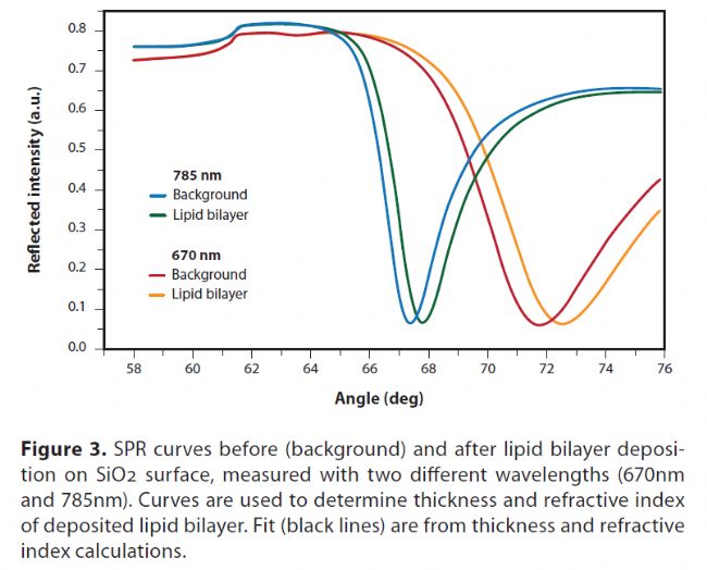 脂質(zhì)體或脂雙分子層形式的支撐脂層可以沉積在SPR傳感器載玻片上。MP-SPR是一種在不知道沉積層厚度和折射率的情況下確定沉積層厚度和折射率的獨(dú)特方法。支持脂質(zhì)層可以進(jìn)一步用于藥物發(fā)現(xiàn)和開發(fā)、生物傳感和生物物理學(xué)等領(lǐng)域,以確定分子與脂質(zhì)層的相互作用。