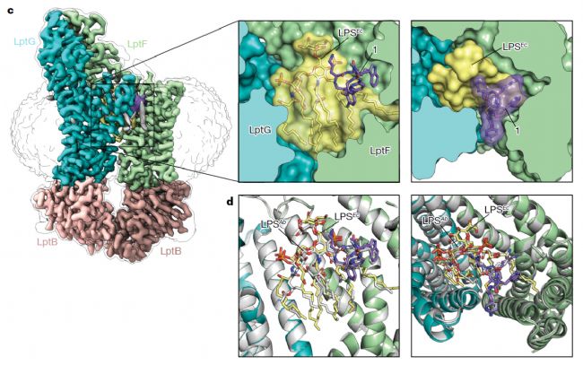 圖1c、不動桿菌LptB2FG復(fù)合物與LPS、化合物1結(jié)合的內(nèi)膜冷凍電鏡結(jié)構(gòu)d,轉(zhuǎn)運體腔中不動桿菌LptB2FG與不動桿菌LPS、化合物1結(jié)合的冷凍電鏡圖(白色),與大腸桿菌LPS和1結(jié)合不動桿菌LptB2FG的結(jié)構(gòu)疊加。