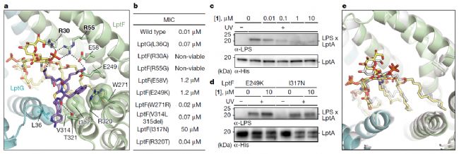 圖2. 轉(zhuǎn)運體中化合物1與LPS結(jié)合的中間態(tài)。a,LptF與LPS及化合物1的三元復(fù)合體結(jié)構(gòu)圖, c,d, 化合物1可抑制野生型LptB2FGC向LptA轉(zhuǎn)運LPS(c),但對LptB2FE249KGC或LptB2FI317NGC 無效(d)(Azure多功能分子成像系統(tǒng)拍攝)。e,轉(zhuǎn)運體腔中LptB2FG結(jié)合LPS(白色)與LptB2FG-LPS-1結(jié)構(gòu)的疊加圖。