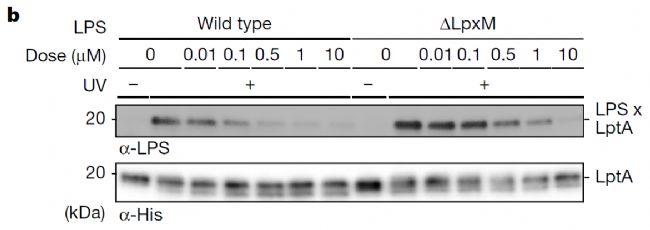 作者隨后構(gòu)建了LPS的LpxM缺失突變體,探究不動桿菌LPS的結(jié)構(gòu)改變對化合物1抑制效力的影響。Western Blot實驗顯示(Azure多功能分子成像系統(tǒng)成像),當化合物1濃度達到抑制野生型LPS運輸所需濃度的20倍時,從大腸桿菌ΔlpxM分離的LPS的運輸是可能的(圖3b)。不動桿菌ΔLpxM LPS對化合物1的易感性比野生型低30倍 ,與此結(jié)果一致。由于ΔLpxM菌株毒力較低,因此lpxM缺失可能不會導(dǎo)致體內(nèi)大環(huán)肽的易感性降低。
