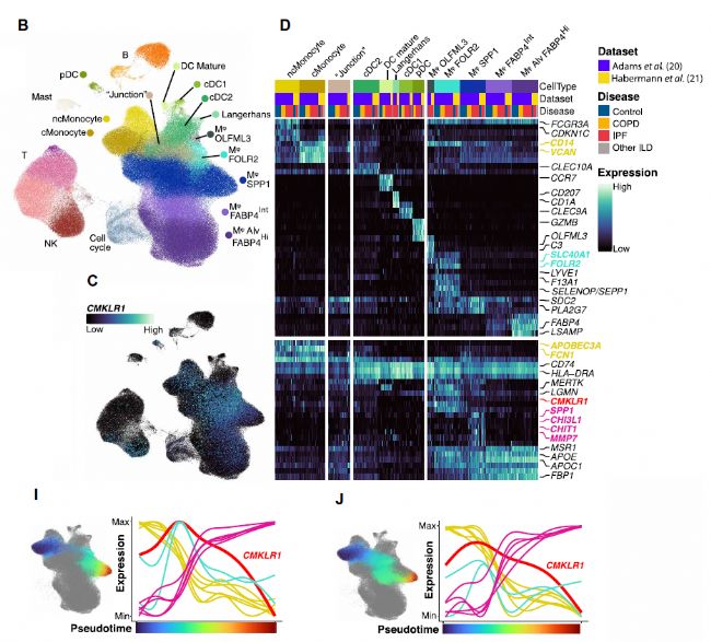 為研究CMKLR1在IPF肺免疫細(xì)胞中的作用,作者對(duì)兩個(gè)具有>300,000個(gè)免疫細(xì)胞的全肺單細(xì)胞RNA測(cè)序(scRNA-seq)數(shù)據(jù)集進(jìn)行探索分析。按不同表型,巨噬細(xì)胞被分為包含Alv-Mφ (FABP4Hi)和FABP4Int-Mφ的肺泡巨噬細(xì)胞,以及3組非肺泡巨噬細(xì)胞:SPP1- m φ組、FOLR2-Mφ組及罕見(jiàn)的OLFML3-Mφ群體。