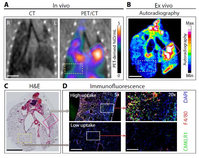 近日,匹茲堡大學(xué)在Science Advances雜志(IF:13.6)發(fā)表了題為“Noninvasive assessment of the lung inflammation-fibrosis axis by targeted imaging of CMKLR1”的文章,研究了cmklr1靶向的PET在小鼠纖維化肺損傷模型中監(jiān)測(cè)MDMφ積累動(dòng)力學(xué)的潛力,并確定了其作為纖維化肺疾病內(nèi)分型和預(yù)后生物標(biāo)志物的臨床相關(guān)性。