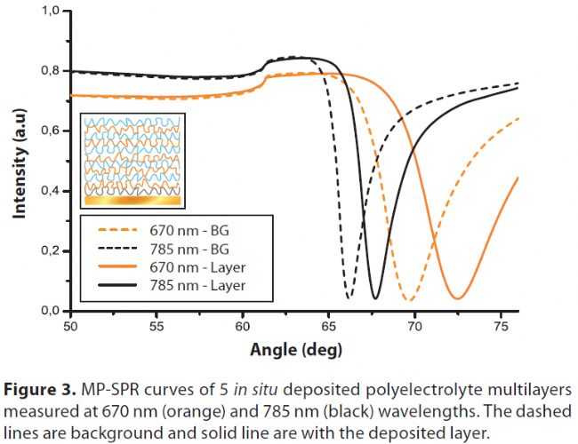 多參數(shù)表面等離子體共振(MP-SPR)可以在不知道薄膜厚度和折射率的前提下測定薄膜的厚度和折射率。采用MP-SPR雙波長法對(duì)聚電解質(zhì)多層進(jìn)行測量,并采用LayerSolver™軟件模塊進(jìn)行分析。發(fā)現(xiàn)5層雙層膜的厚度為16.8nm, 785nm處的RI為1.48。