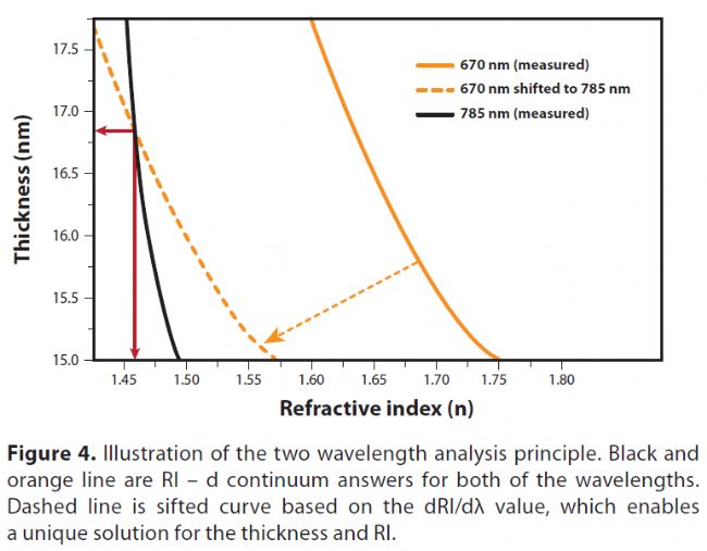 使用光學(xué)擬合軟件MP-SPR Navi™LayerSolver™對(duì)測量的SPR曲線進(jìn)行建模(圖5)。該軟件改變RI和厚度值,以獲得兩個(gè)波長的RI - d連續(xù)答案。其中一條曲線隨材料的光學(xué)色散(dRI/dλ)關(guān)系移位,對(duì)應(yīng)于其他波長(圖4)。位移曲線和測量曲線交點(diǎn)的值為樣本的RI (n)和d提供了唯一的解。