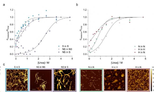 圖10. 不同α - syn纖維在不同溶液條件下的解聚曲線。(a)在無鹽(NS,紫色)或有鹽(S,藍(lán)色)的條件下制備和測量的纖維的穩(wěn)定性。在鹽(深紫色)的存在下進(jìn)行解聚,以直接比較它們的穩(wěn)定性。(b)在中性(pH 7.4, N,綠色)或酸性(pH 5, H,淺橙)條件下制備并測定纖維的穩(wěn)定性。(c)AFM分析纖維形態(tài)