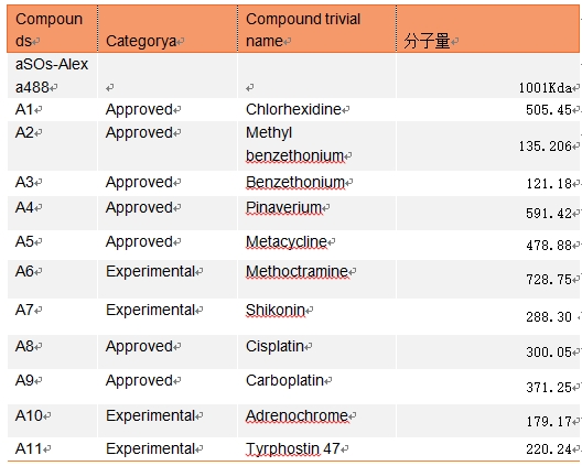 為了尋找可破壞aSOs與膜結(jié)合的化合物,篩選了兩個(gè)數(shù)據(jù)集的化合物,包括FDA批準(zhǔn)的(Prestwick文庫)和臨床階段的生物活性藥物(Biomol文庫)。我們使用EGCG和橄欖苦苷作為陽性對照和陰性對照,以鈣綠黃素實(shí)驗(yàn)為指標(biāo)篩選了11種最優(yōu)化合物A1-A11。