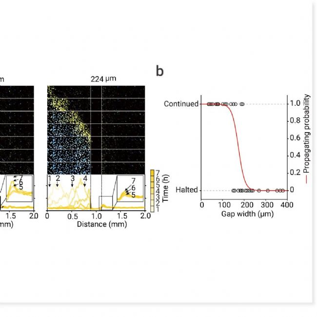 a. 在波起始區(qū)域 (左) 和非起始區(qū)域 (右) 之間產(chǎn)生間隙。細(xì)胞死亡 (青色) 和 ROS (黃色) 跨間隙傳播的延時(shí)圖像序列。使用 CellROX 染料監(jiān)測(cè) Erastin 處理的細(xì)胞中的 ROS。在特定時(shí)間點(diǎn)沿 2 mm 距離量化 ROS 的平均熒光強(qiáng)度。b. 波穿過(guò)不同間隙寬度 (35-380 微米) 的概率。