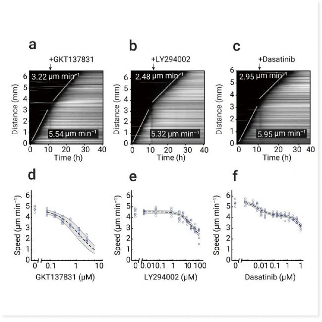a-c. 添加 GKT137831 (1.25 µM)、LY294002 (100 µM) 或 Dasatinib (0.6 µM) 可減緩鐵死亡觸發(fā)波。d-f,波速與 GKT137831、LY294002 和 Dasatinib 濃度的關(guān)系。