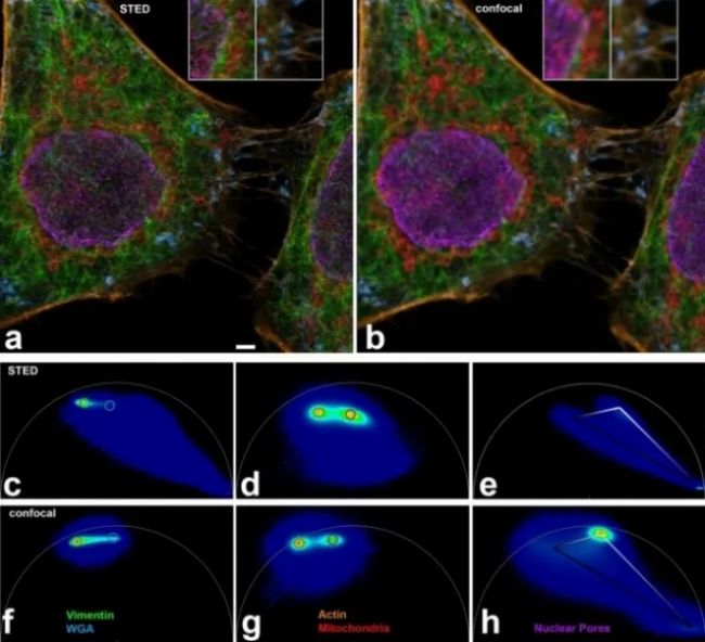 2010年前后,隨著STED染料的研發(fā)、脈沖白激光的使用和受激輻射激光的選擇變多,研究者們發(fā)現(xiàn)使用750nm波長(zhǎng)的激光器可以對(duì)ATTO 647N和 ATTO 655等紅外熒光染料進(jìn)行更有效的光損耗,而且在592nm受激輻射光成像時(shí)由樣品或封片劑等原因造成的信號(hào)模糊也明顯減輕了。一方面研究者們可以選擇成像效果更好的紅外染料進(jìn)行單色STED,也可以使用750nm和592nm受激輻射光的聯(lián)用來(lái)實(shí)現(xiàn)2-3個(gè)通道的STED成像了。