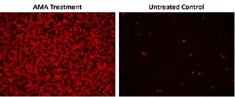 圖3.使用 MitoROS 580 對(duì) HeLa 細(xì)胞中的超氧化物進(jìn)行熒光成像測(cè)量。HeLa 細(xì)胞以每孔 100,000 個(gè)細(xì)胞的密度接種在 100 µL 中,并在具有黑色壁和透明底部的 96 孔板中孵育過(guò)夜。對(duì)于 AMA 處理組,在 37°C 下用 50 µM 抗霉素 A (AMA) 處理細(xì)胞 30 分鐘,然后用 MitoROS 580 孵育 1 小時(shí)。在未處理的對(duì)照組中,在 37°C 下用 MitoROS 580 孵育細(xì)胞 1 小時(shí),無(wú)需任何先前的 AMA 處理。使用帶有 TRITC 濾光片的熒光顯微鏡測(cè)量熒光信號(hào)。