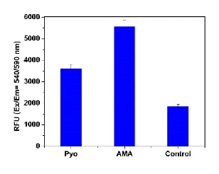 圖4.使用 MitoROS 580 檢測(cè) HeLa 細(xì)胞中的細(xì)胞內(nèi)超氧化物。HeLa 細(xì)胞以每孔 100,000 個(gè)細(xì)胞的密度接種在 100 µL 培養(yǎng)基中,并在具有黑色壁和透明底部的 96 孔板中孵育過(guò)夜。第二天,用 50 µM 綠膿菌素 (Pyo)、50 µM 抗霉素 A (AMA) 處理細(xì)胞,或不處理作為對(duì)照。這些處理在 37°C 下進(jìn)行 30 分鐘。隨后,將細(xì)胞在 37°C 下與 MitoROS 580 一起孵育 1 小時(shí)。使用 CLARIOstar 微孔板讀數(shù)儀 (BMG Labtech) 測(cè)量熒光信號(hào),激發(fā)/發(fā)射波長(zhǎng)為 540/590 nm,截止波長(zhǎng)為 570 nm,使用底部讀取模式。