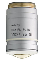 以下圖為例,物鏡上標(biāo)識(shí)的“100X/1.25 OIL”,指100倍放大倍數(shù),NA=1.25,“OIL”指需要使用鏡油。