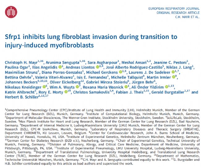 Mayr CH, Sengupta A, Asgharpour S, Ansari M, Pestoni JC, Ogar P, Angelidis I, Liontos A, Rodriguez-Castillo JA, Lang NJ, Strunz M, Porras-Gonzalez D, Gerckens M, De Sadeleer LJ, Oehrle B, Viteri-Alvarez V, Fernandez IE, Tallquist M, Irmler M, Beckers J, Eickelberg O, Stoleriu GM, Behr J, Kneidinger N, Wuyts WA, Wasnick RM, Yildirim AÖ, Ahlbrecht K, Morty RE, Samakovlis C, Theis FJ, Burgstaller G, Schiller HB. Sfrp1 inhibits lung fibroblast invasion during transition to injury-induced myofibroblasts. Eur Respir J. 2024 Feb 8;63(2):2301326. doi: 10.1183/13993003.01326-2023. PMID: 38212077; PMCID: PMC10850614.