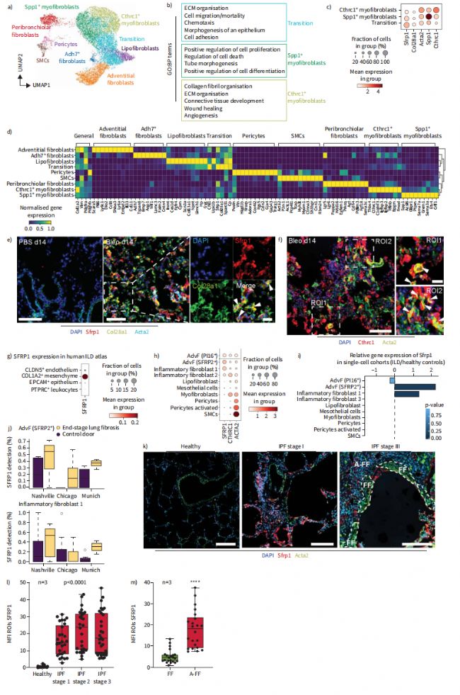為了研究臨床相關(guān)性,我們比較了博來霉素損傷后Col1a2+細胞與ILD患者Col1a2+細胞。Sfrp1特異于COL1A2+間充質(zhì)細胞,在一些CLDN5+內(nèi)皮細胞中表達較弱(圖2G)。表達僅限于表皮成纖維細胞和疾病富集的“炎癥”成纖維細胞亞群(圖2G和H)。在所有三個研究隊列中,疾病誘導(dǎo)成纖維細胞狀態(tài)下Sfrp1的表達增加是一致的(圖2I和J)。重要的是,在IPF組織中,更多的Sfrp1+成纖維細胞存在于輕度受影響(早期)區(qū)域,而終末期區(qū)域有更多的ACTA2+肌成纖維細胞定位于成纖維細胞灶(圖2K-M)。這些數(shù)據(jù)表明,在人肺纖維形成中,成纖維細胞狀態(tài)的軌跡與在博來霉素模型中看到的相似。
