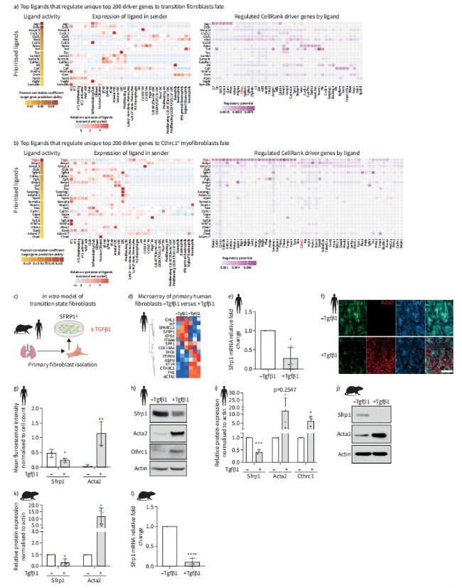 在體外培養(yǎng)分離的原代小鼠和人肺成纖維細胞時,我們觀察到標記基因的表達與體內(nèi)的Strp1+過渡狀態(tài)一致(圖6C和D)。TGFβ1刺激后,SPP1和纖維化相關(guān)ECM標志物fn1上調(diào),而Sfrp1下調(diào)(圖6D)。我們使用定量PCR(圖6E)、免疫熒光(圖6F和G)和Western blot(圖6I-K)在人和小鼠原代肺成纖維細胞中驗證了這些觀察結(jié)果。因此,我們驗證了我們的計算預(yù)測,證明TGFβ1是原代成纖維細胞中控制Sfrp1和肌成纖維細胞標記物表達的主開關(guān)。